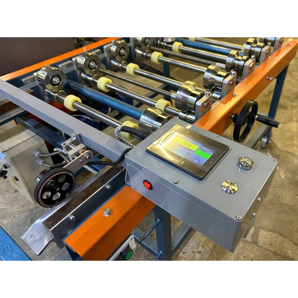 Станок может использоваться как в стандартном варианте комплектации, так и с дополнительными вспомогательными опциями, существенно расширяющими возможности станка и упрощающие работу с ним. Так мы предлагаем использовать к станку напольный разматыватель металла, который благодаря его небольшому размеру и весу можно использовать прямо на месте монтажа кровли, для этого на размотчик ложится рулон металла и подавая его в станок происходит процесс прокатки фальцевых панелей. Одним из вариантов дополнительной комплектации к станку является установка на него датчика длины, который дает возможность прокатывать кровельные панели одинаковой длины в полуавтоматическом режиме, без необходимости разметки панелей вручную с помощью линейки или рулетки, как это было ранее. Таким образом существенно экономится время при работе на станке и увеличивается точность изготавливаемых панелей. В комплекте с датчиком длины в большинстве случаев приобретают также нож для поперечной резки металла, позволяющий после прокатки картины нужной длины отрезать ее от общего рулона металла.