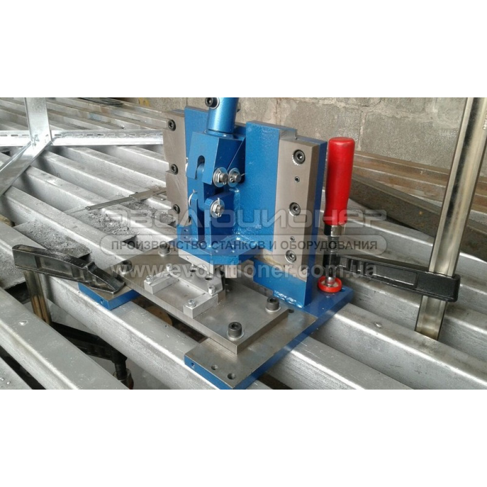 В данном варианте ручной дыропробивной пресс выполняет функцию вырезания отверстий, которые одновременно являются соединительными отверстиями с отверстиями других изделий и формируют в конечном счете готовую конструкцию. При отсутствии такого ручного пресса заказчик столкнулся бы с необходимостью приобретения достаточно сложной линии по высечке и прокатке требуемого изделия-профиля. В нашем же случае все получилось решить путем приобретения специально предназначенного для этого ручного вырубного пресса.
